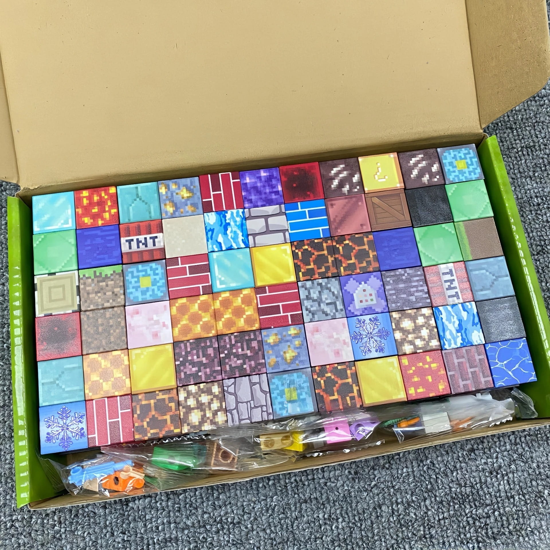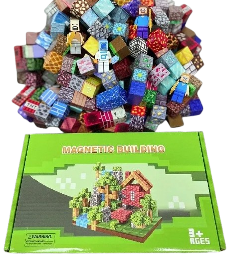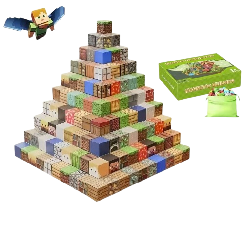 Zestaw zawiera różnorodne magnetyczne klocki, każdy z unikalnymi wzorami inspirowanymi teksturami z gry Minecraft – znajdziesz tu bloki ziemi, kamienia, drewna, rudy diamentu, lawy i wiele innych! Dzięki wbudowanym magnesom, klocki łatwo łączą się ze sobą, umożliwiając tworzenie stabilnych i efektownych budowli.